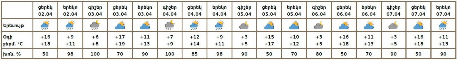 Ապրիլի 3-ի գիշերը, 4-ին, 7-ի երեկոյան ժամերին սպասվում է անձրև։ Ապրիլի 3-ի ցերեկը, 5-6-ին, 7-ի գիշերը սպասվում է առանց տեղումների եղանակ։