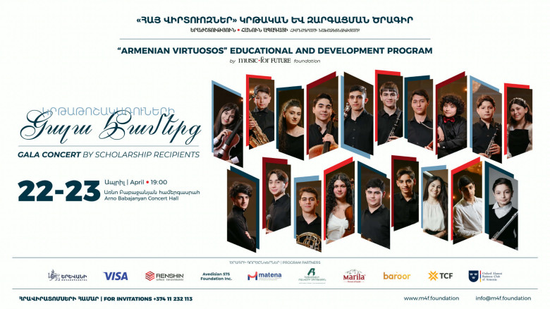 Դասական երաժշտության սիրահարները ապրիլի 22-ին և 23-ին՝ ժամը 19։00-ին, Առնո Բաբաջանյան համերգասրահում կարող են ներկա գտնվել «Երաժշտություն հանուն ապագայի» հիմնադրամի «Հայ վիրտուոզներ» կրթական և զարգացման ծրագրի կրթաթոշակառուների ավարտական գալա համերգին։