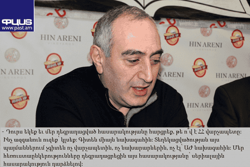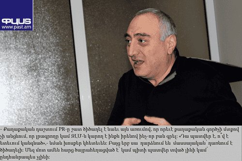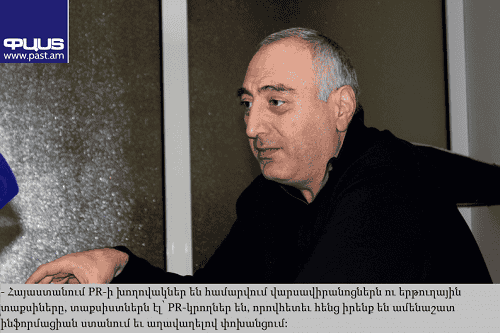 ՔԱՂԱՔԱԿԱՆԱյսօր «Տեսակետ» մամուլի ակումբի հյուրեր քաղաքական տեխնոլոգ Կարեն Քոչարյանը եւ սոցիոլոգ Ահարոն Ադիբեկյանը խոսեցին PR երեւույթի մասին, Հայաստանում քաղաքական PR-ի լինել-չլինելու վերաբերյալ: Ըստ Ահարոն Ադիբեկյանի՝ Հայաստանում քաղաքական-սոցիալական տեղեկատվության 25 տոկոսը շուրթից շուրթ է գնում: Նա նաեւ նշեց, որ օտարերկրացիների մոտ հայերը միայն Եղեռնի հետ են ասոցացվում, լավագույն դեպքում հիշում են Արամ Խաչատրյանին եւ Շառլ Ազնավուրին: