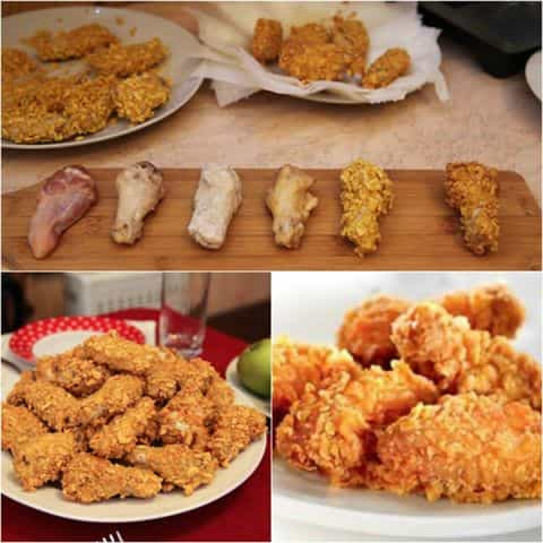 Եթե ուզում ենք, կծու լինի, կաթով և ձվով զանգվածին պապրիկա և կծու պղպեղ ենք խառնում։ Եթե ուզում ենք կարող ենք սխտոր էլ ճզմել մեջը, կարող ենք նաև մի քիչ աղ անել։ Ամբողջ գաղտնիքը պաքսիմատի մեջ է, որի մեջ էլ պետք է թաթախենք թևիկները։ Վերցնում ենք եգիպտացորենի փաթիլները, ձեռքերով մանրացնում ենք։ Ձվով զանգվածի մեջ թաթախելուց հետո թաթախում ենք եգիպտացորենի փաթիլների մեջ։