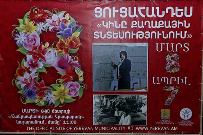 ՀԱՍԱՐԱԿՈՒԹՅՈՒՆԿանանց միջազգային օրվա՝ Մարտի 8-ի առթիվ, Կարեն Դեմիրճյանի անվան Երևանի մետրոպոլիտենի «Հանրապետության հրապարակ» կայարանի սպասասրահում բացվել է «Կինը՝ քաղաքային տնտեսությունում» խորագրով լուսանկարների ցուցահանդեսը: Երևանի քաղաքապետարանի նախաձեռնությամբ՝ Երևան քաղաքի պատմության թանգարանի հետ կազմակերպված ցուցադրությանը ներկայացվել է խորհրդային շրջանից մինչ մեր օրերը ամենատարբեր ոլորտներում կնոջ զբաղվածության ու դերի մասին պատմող 32 լուսանկար: