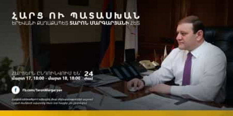 ՀԱՍԱՐԱԿՈՒԹՅՈՒՆՄարտի 17-ի ժամը 18:00-ից մինչեւ մարտի 18-ի ժամը 18:00-ն Երեւանի քաղաքապետ Տարոն Մարգարյանի ֆեյսբուքյան էջում քաղաքացիները կարող են գրել իրենց հուզող ու հետաքրքրող հարցերը, որոնց նա կպատասխանի աշխատանքից հետո՝ առաջիկա հանգստյան օրերին: