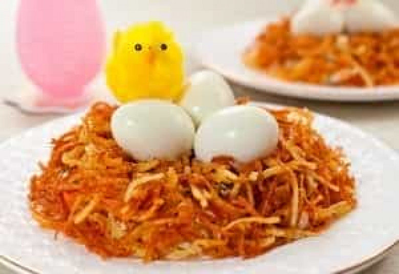 Կարտոֆիլը խոշոր քերիչով անցկացնել: Առատ բուսայուղի մեջ մաս-մաս տապակել այն, լցնել քամիչի մեջ: Երբ ավելորդ յուղը քամվի, աղ ցանել, դնել ափսեի մեջ: Վրան փոս անել, տեղադրել մաքրած ձվերը: Որպեսզի Ծտի բույնը ավելի իրական լինի, ափսեի եզրին փոքրիկ խաղալիք ճուտիկ դրեք: