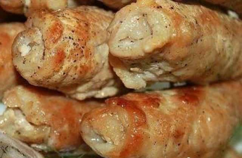 3. Ստացված զանգվածից լցնել մսի վրա, պանիրը կտրել երկարավուն շերտով՝ 0,5x 0.5 սմ, դնել խճողակի վրա։ Փաթաթել ռուլետաձև, թելով կապել։
