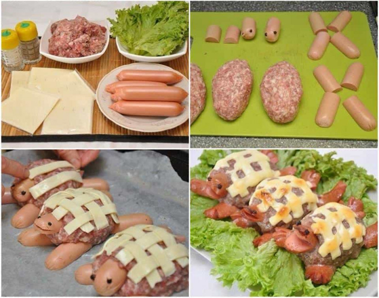 - Նրբերշիկները սկզբում կտրում ենք լայնությամբ, այնուհետև երկարությամբ: Նրբերշիկի ծայրի հատվածում դանակով անում ենք կտրվածքներ, որպեսզի ստացվեն “թաթիկներ”: Նույնը անում ենք ևս 2 նրբերշիկի հետ: Այնուհետև մնացած 2 նրբեշիկները բաժանում ենք 3 մասի: Ծայրի հատվածներից ստանում ենք կրիաների գլուխները՝ անելով փոքր կտվածքներ որպես բերաններ, իսկ մեջտեղի հատվածից՝ պոչերը: