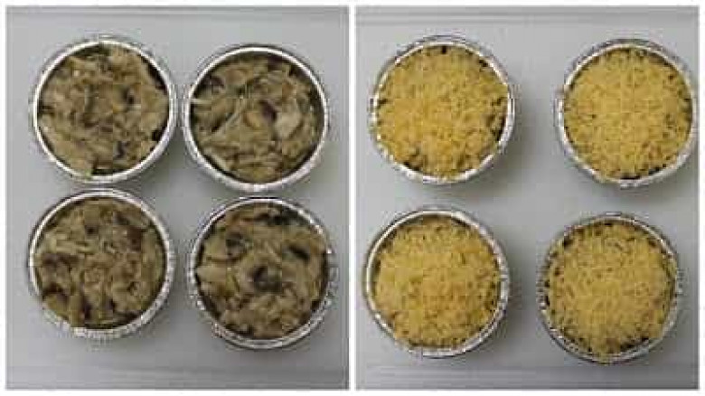 Ավելացնել ստացվածին: Լցնել փոքրիկ տարաների մեջ և վրան ավելացնել քերիչով անցկացրած պանիրը: Դնել ջեռոցում. 180°C ջերմաստիճանում՝ թողնելով10 րոպե: