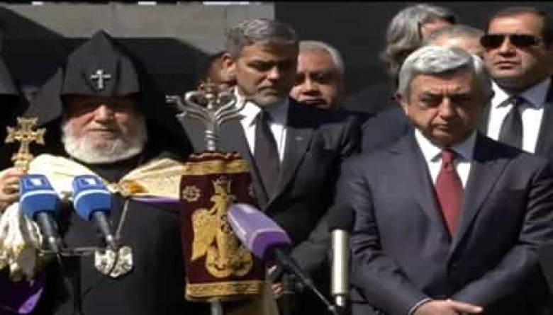 Պետության ղեկավարին ուղեկցում են Շառլ Ազնավուրը, աշխարհահռչակ դերասան Ջորջ Քլունին, Ավրորա մրցանակի մասնակիցները, Ամենայն հայոց կաթողիկոս Գարեգին Բ-ն: Ջորջ Քլունին ծաղիկներ է դրել Ծիծեռնակաբերդի հուշահամալիրում: Ամենայն հայոց կաթողիկոսը Հայր մերից հետո նաեւ սգո աղոթք է ընթերցել Ցեղասպանության անմեղ զոհերի հիշատակին։