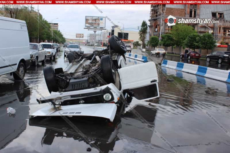 Երևանում Нива-ն բախվել է արգելապատնեշին և շրջվել (լուսանկարներ)