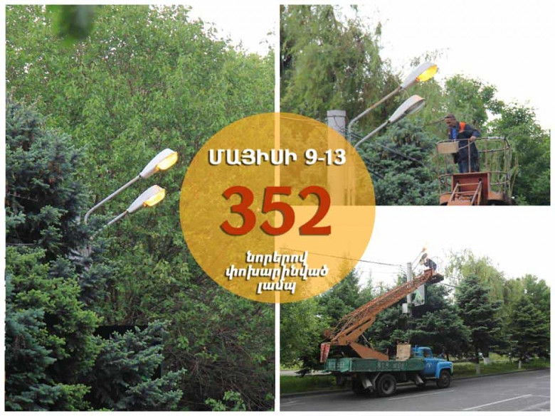 ՀԱՍԱՐԱԿՈՒԹՅՈՒՆՄայրաքաղաքի արտաքին լուսավորության համակարգի անխափան աշխատանքն ապահովելու նպատակով ամենօրյա աշխատանքներ են իրականացվում: Երևանի քաղաքապետարանի «Երքաղլույս» ՓԲԸ-ից տեղեկացնում են, որ մայիսի 9-13-ն ընկած ժամանակահատվածում նորերով է փոխարինվել փողոցներում, բակերում, վերգետնյա և ստորգետնյա անցումներում, ինչպես նաև այգիներում ու պուրակներում առկա 352 վնասված լամպ: Նախորդ շաբաթվա ընթացքում Երևանի արտաքին լուսավորության ցանցին է միացվել ևս 2 փողոց: