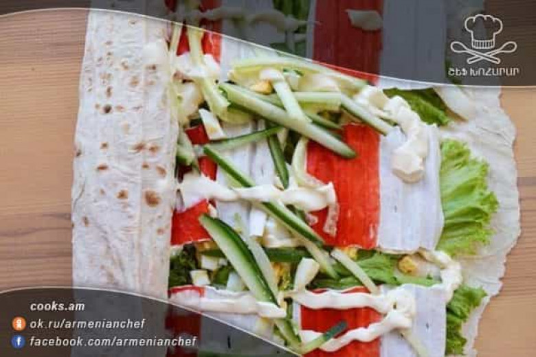 - Փռում ենք լավաշը, վրան քսում մայոնեզ: Ցանկության դեպքում կարելի է ավելացնել մի փոքր կետչուպ: