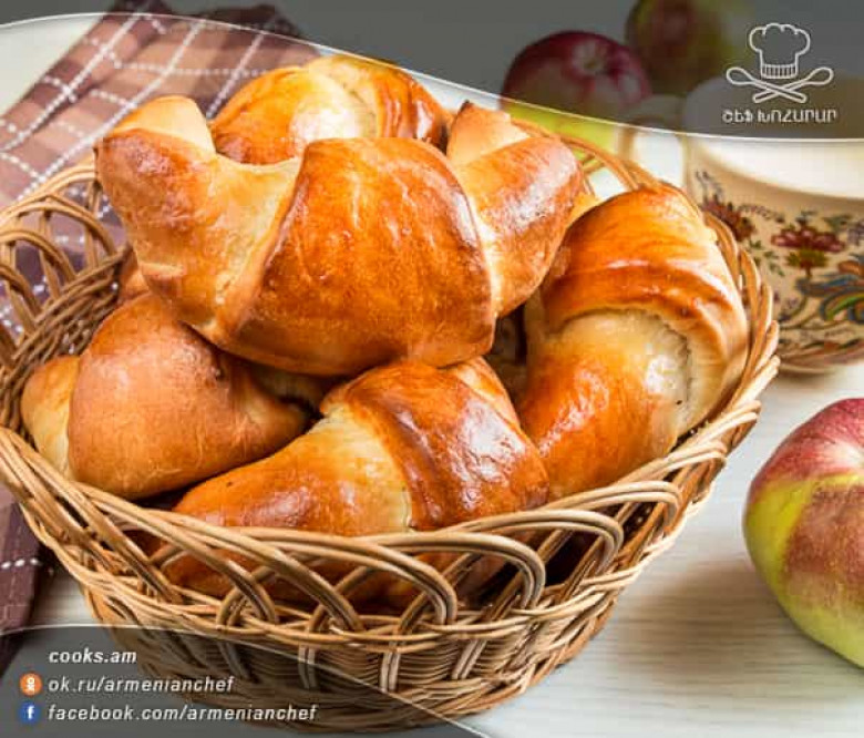 - Կրուասանները դնում ենք տապակի վրա և 20-30 րոպե թողնում ենք։ Այնուհետև վրան հարած ձու ենք քսում և մոտ 15-20 րոպեով տեղափոխում մինչև 200 աստիճան տաքացրած ջեռոցի մեջ` մինչև կարմրեն։