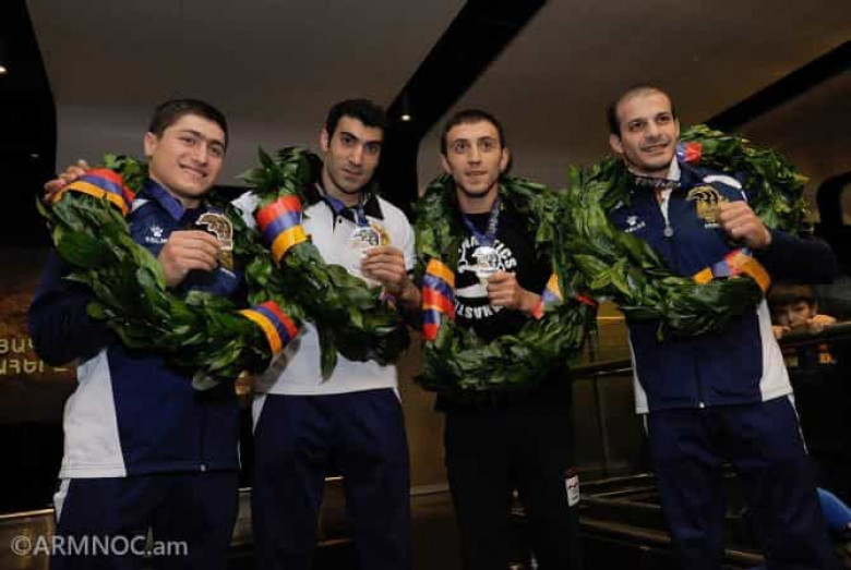 Բեռն-Մոսկվա-Երևան չվերթով Հայաստան վերադարձան Եվրոպայի առաջնության չեմպիոն Հարություն Մերդինյանը, փոխչեմպիոններ Արթուր Դավթյանը, Վահագն Դավթյանը և Արթուր Ավետիսյանը, ինչպես նաև թիմի մյուս անդամները և մարզիչները` գլխավոր մարզիչ Հակոբ Սերոբյանի գլխավորությամբ: Այս մասին տեղեկացրին ՀԱՕԿ լրատվության բաժնից:
