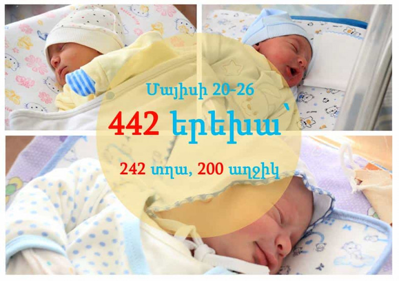 ՀԱՍԱՐԱԿՈՒԹՅՈՒՆՄայիսի 20-26-ը մայրաքաղաքի ծննդատներում ծնվել է 442 երեխա՝ 242 տղա, 200 աղջիկ: