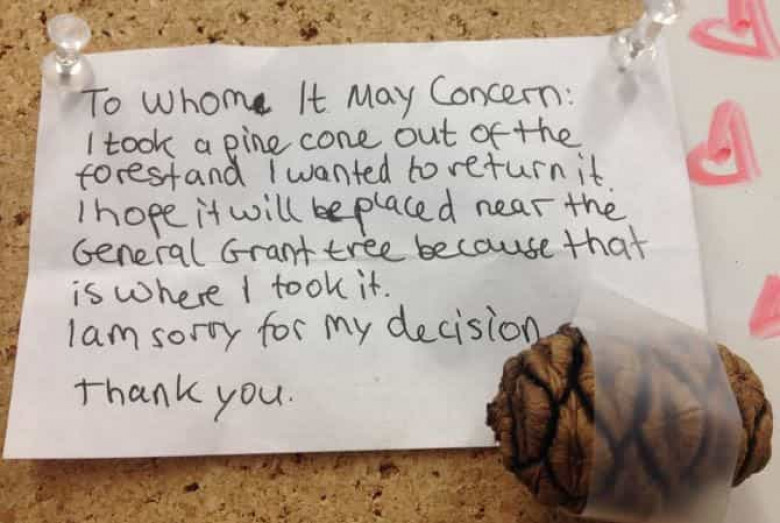 «Ես անտառից կոն եմ վերցրել, բայց որոշեցի վերադարձնել այն: Հուսով են, որ կոնը կդնեն այն ծառի կողքին, որտեղից ես այն վերցրել եմ: Ներողություն եմ խնդրում իմ արարքի համար»,- ընդգծել Է պատանյակն իր նամակում, որն ամրացված Է ծառերից մեկի վրա: Նա ծեփաժապավենով նամակին Է կցել կոնը: