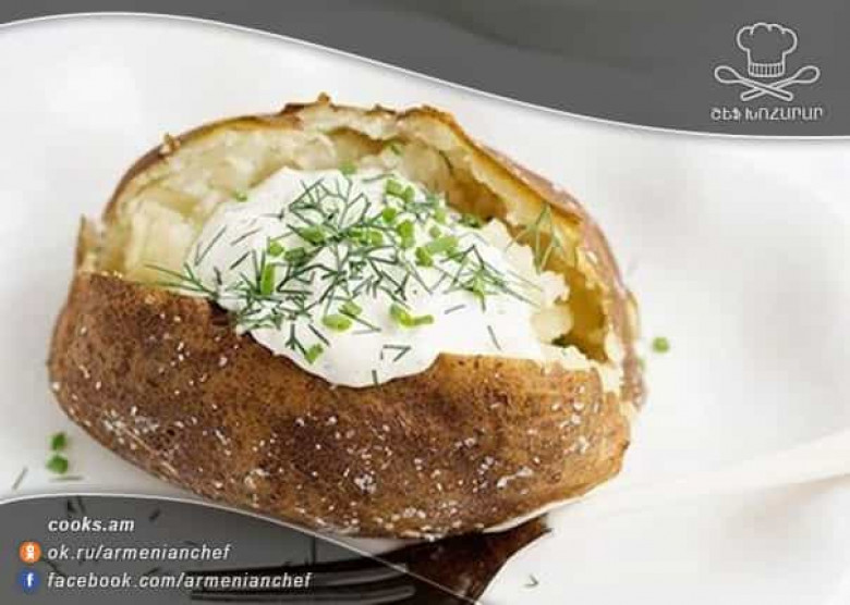- Ապա ջեռոցից հանում ենք եփած կարտոֆիլը կտրում մեջտեղից ու վրան լցնում պատրաստի սոուսը: Եվ վերջ ամեն բան պատրաստ է: