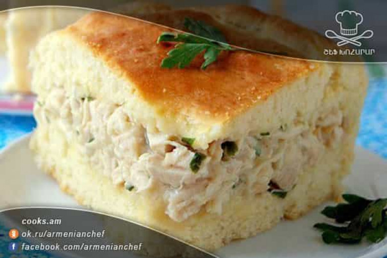 Խառնում ենք հավը, բեշամել սոուսը, կտրատած կանաչին, աղն ու պղպեղը ։