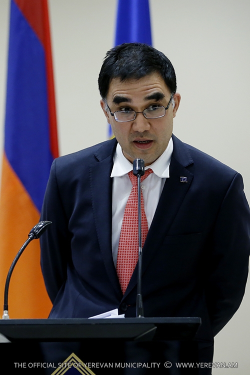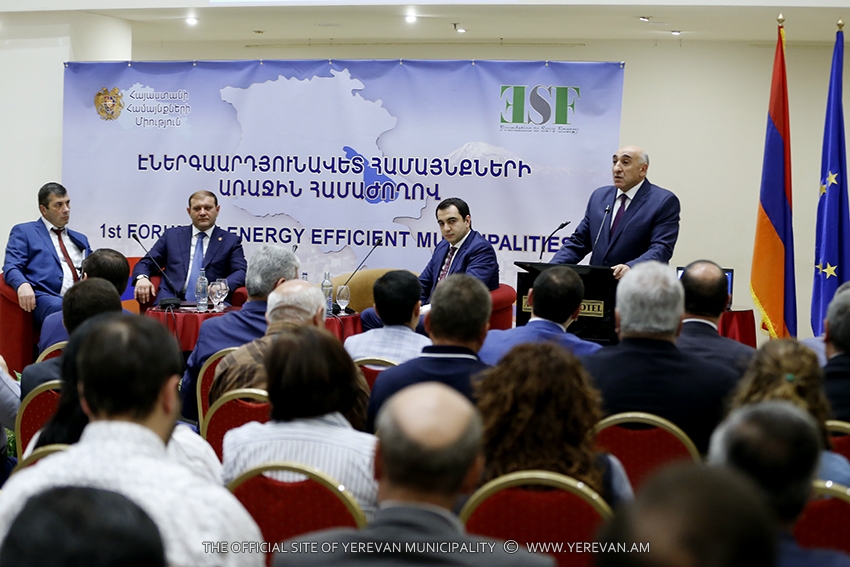 «Հաշվի առնելով այս ամենը և գիտակցելով մայրաքաղաքի պատասխանատվությունը՝ որպես խոշոր էներգասպառող, Երևանն այսօր քաղաքային տնտեսության տարբեր ոլորտներում իրականացնում է էներագախնայողությանն ուղղված ծրագրեր: Եվ որպես ռազմավարական քայլ, մենք միացել ենք նաև Եվրոպական միության «Քաղաքապետերի դաշնագիր» նախաձեռնությանը՝ մեր լիազորությունների շրջանակում պարտավորվելով մինչև 2020 թվականը առնվազն 20%-ով կրճատել ջերմոցային գազերի արտանետումներն ու կայուն էներգետիկ զարգացման սկզբունքներին համապատասխան ապահովել քաղաքային տնտեսության զարգացումը: Այդ նպատակով մշակվել է «Երևան քաղաքի Կայուն էներգետիկ զարգացման գործողությունների ծրագիրը», որտեղ նախանշվել են քաղաքային տնտեսության ենթակառուցվածքների էներգաարդյունավետության բարձրացմանն ուղղված կոնկրետ միջոցառումները։ Պետք է հատկանշեմ, որ մեր կողմից առանձնակի է կարևորվում Եվրոպական նախաձեռնություններին տարբեր ձևաչափերով միանալը, ինչպես նաև Եվրոպական կառույցների հետ սերտ համագործակցությունը, ինչի արդյունքում բազմաթիվ բնագավառներում արդեն իսկ ունենք հաջողված ծրագրեր»,- ընդգծել է քաղաքապետը։