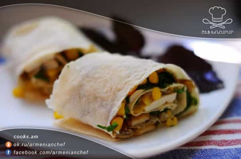 - Եգիպտացորենի ջուրը թափում ենք։ Մաղադանոսը կտրատում ենք։ Եթե լավաշը ուղղանկյունաձև է և մեծ, ապա 2 մասի ենք բաժանում, եթե ոչ թողնում ենք այնպես, ինչպես կա։ Շերտերով կտրատած պանիրը շարում ենք լավաշի վրա,(բոլոր մթերքները լավաշի չափով առանձնացնում ենք, որպեսզի բավականացնի) մի քիչ աղ ենք անում և պանրի վրա ենք դնում սոխով տապակած սունկը։