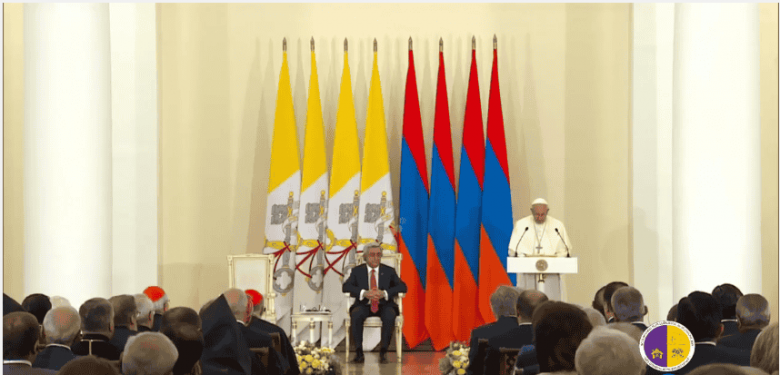 Սրտանց երախտապարտ եմ Ձեզ, պարոն Նախագահ, Հայաստանի Կառավարության և բնակչության անունից ինձ ուղղված Ձեր բարի գալուստի սիրալիր խոսքերի համար, ինչպես նաև ինձ հնարավորություն ընձեռելու համար՝ Ձեր ազնիվ հրավերի շնորհիվ, փոխադարձելու անցյալ տարի Վատիկան կատարած Ձեր այցը, երբ Սուրբ Պետրոսի տաճարում՝ Ծայրագույն Պատրիարք և Ամենայն Հայոց Կաթողիկոս Ն.Ս.Օ.Տ.Տ. Գարեգին Բ-ի և Մեծի Տանն Կիլիկիո Կաթողիկոս Ն.Ս.Օ.Տ.Տ. Արամ Ա-ի, և Տանն Կիլիկիո Կաթողիկե հայոց Պատրիարք երջանկահիշատակ Ն.Ե.Ներսես Պետրոս XIX-ի հետ միասին , ներկա գտնվեցիք հանդիսավոր արարողությանը։ Այդ առիթով հիշատակվեց Մեծ Եղեռնի 100-րդ տարելիցը, որը հարվածեց ձեր ժողովրդին և որը անչափ անհամար զոհեր պատճառեց։ Այդ ողբերգությունը, ցավոք, գլխավորեց անցյալ դարի անմարդկային աղետների տխուր ցուցակը, որոնք իրականացվեցին ցեղապաշտական, գաղափարախոսական և կրոնական մոլորեցնող շարժառիթներով և որոնք մթագնեցին մարդասպանների միտքը, ովքեր նպատակադրվեցին ոչնչացնելու մինչև իսկ ամբողջ ժողովուրդներ։