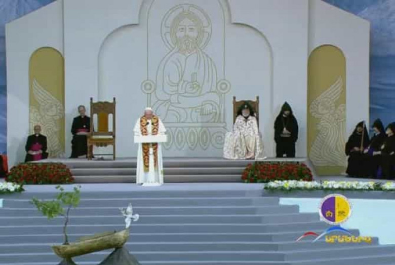 Շատ էի փափագում այցելել այս սիրելի երկիրը, ձեր Աշխարհը, որ առաջինն ընդունեց քրիստոնեական հավատը: Ինձ համար առանձնաշնորհություն է գտնվել այս բարձունքների վրա, որտեղ Արարատ լեռան հայացքի ներքո նույնիսկ լռությունը մեզ խոսուն է թվում. խաչքարերը մեզ պատմում են անկրկնելի մի պատմություն՝ ամրակուռ հավատով և սոսկալի տառապանքներով հյուսված, մի պատմություն՝ հարուստ Ավետարանի սքանչելի վկաներով, որոնց ժառանգներն եք դուք: Գալիս եմ Հռոմից ուխտավոր՝ ձեզ հետ հանդիպելու և սրտի խորքից բխող իմ զգացումը արտահայտելու. այն ձեր եղբոր սերն է, եղբայ րական գրկախառնումն է ամբողջ Կաթողիկե Եկեղեցու, որ ձեզ սիրում է և ձեր կողքին է: