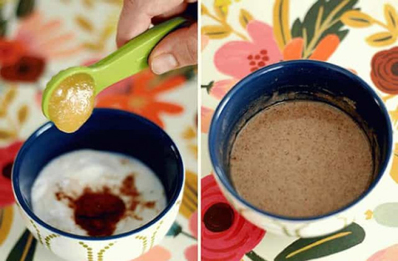 Բոլոր բաղադրիչները խառնեք միմյանց: Կստանաք բավական խիտ զանգված: Դիմակը հաստ շերտով քսեք մաքուր դեմքին՝ խուսափելով շուրթերի և աչքերի հատվածներից: Թողեք դիմակը չորանա: 15-20 րոպե անց մաքրեք տաք ջրով: