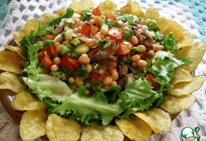 Լցնել կլոր ամանի մեջ, զարդարել չիպսերով ու հազարի տերևներով։
