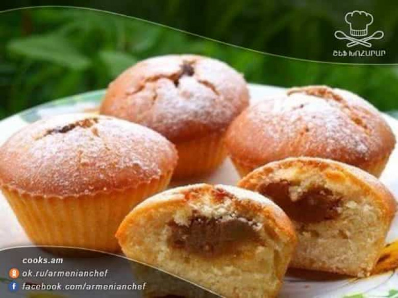 - Խմորը լցնում ենք ձևամանների մեջ և յուրաքանչյուրի մեջտեղում 1-ական թեյի գդալ եփած խտացրած կաթով միջուկ դնում (ավելի լավ է օգտագործել սիլիկոնե ձևամաններ, իսկ եթե ձևամանները սովորական են, լավ կլինի դրանց մեջ թղթեր դնել)։ Այնուհետև միջուկի վրա լցնում ենք 1 ճ/գդ խմորը։