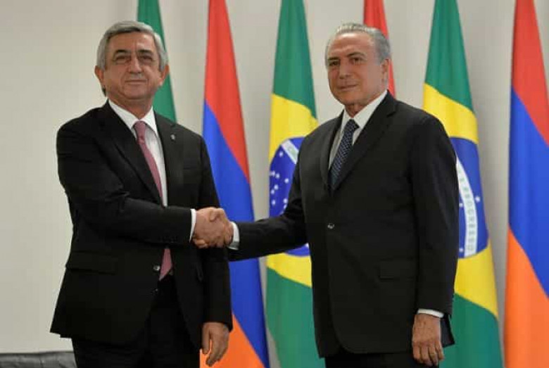 ՔԱՂԱՔԱԿԱՆԱշխատանքային այցով Բրազիլիայի Դաշնային Հանրապետությունում գտնվող Հայաստանի Հանրապետության Նախագահ Սերժ Սարգսյանն օգոստոսի 12-ին, ժամանել է երկրի մայրաքաղաք Բրազիլիա: Դիմավորման պաշտոնական արարողությունից հետո կայացել է Հայաստանի Հանրապետության Նախագահի հանդիպումը Բրազիլիայի Դաշնային Հա նրապետության Նախագահի պաշտոնակատար Միշել Տեմերի հետ: