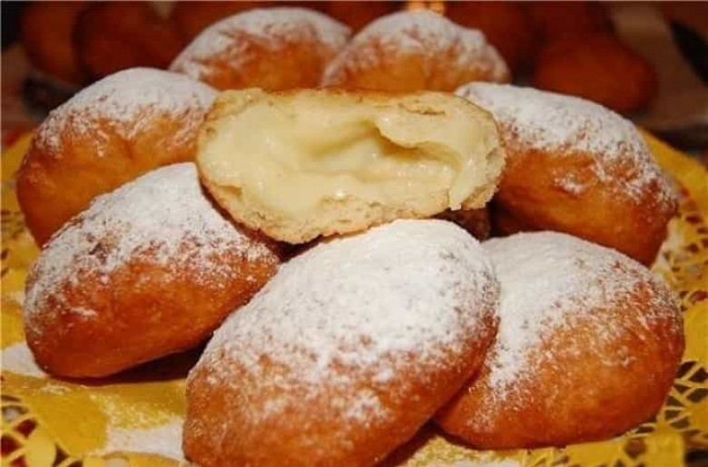 Լցնել 55 աստիճանի ջուր: Շաքարավազը և խմորիչը ցանել վրան: Ծածկել, թողնել 10 րոպե: Ջրի վրա փրփուր պիտի առաջանա: Ավելացնել աղ, վանիլ, կարագ, հարել: Ավելացնել ալյուր, խմոր հունցել, որ ձեռքերի չկպչի: Ծածկել, թողնել 10 րոպե, նորից հունցել, ծածկել, մի ժամ թողել տաք տեղում: Պատրաստել կրեմը: Շաքարավազը, ալյուրը, ձուն, վանիլը լցնել կաթսայի մեջ, ավելացնել սառը կաթ, խառնելով եփել միջին բարձրության կրակով, մինչև թանձրանա: Մեկ ժամ հետո խմորը բաժանել երկու մասի, ամեն մեկը բացել 5 մլ հաստությամբ, թեյի բաժակով շրջանակներ կտրել, մեջը դնել ոչ լիքը թեյի գդալ կրեմ, փակել երկրորդ շրջանակով, ծայրերը փակել, շարել յուղած սինու վրա, թողնել 15 րոպե: Կաթսան լցնել բուսայուղով` մոտ 3 սմ և թխել փքաբլիթները ամեն կողմից կես րոպե: Թողնել մի քիչ սառչեն, շաքարի փոշի ցանել: Մատուցել տաք կակաոյի հետ:
