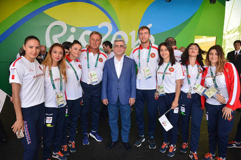 ՀԱՍԱՐԱԿՈՒԹՅՈՒՆԱշխատանքային այցով Բրազիլիայի Դաշնային Հանրապետությունում գտնվող Նախագահ Սերժ Սարգսյանը Հայաստանի ազգային օլիմպիական կոմիտեի նախագահ Գագիկ Ծառուկյանի ուղեկցությամբ օգոստոսի 13-ին Ռիո դե Ժանեյրո քաղաքի օլիմպիական ավանում հանդիպում է ունեցել 31-րդ ամառային օլիմպիական խաղերում Հայաստանը ներկայացնող մարզիկների հետ: