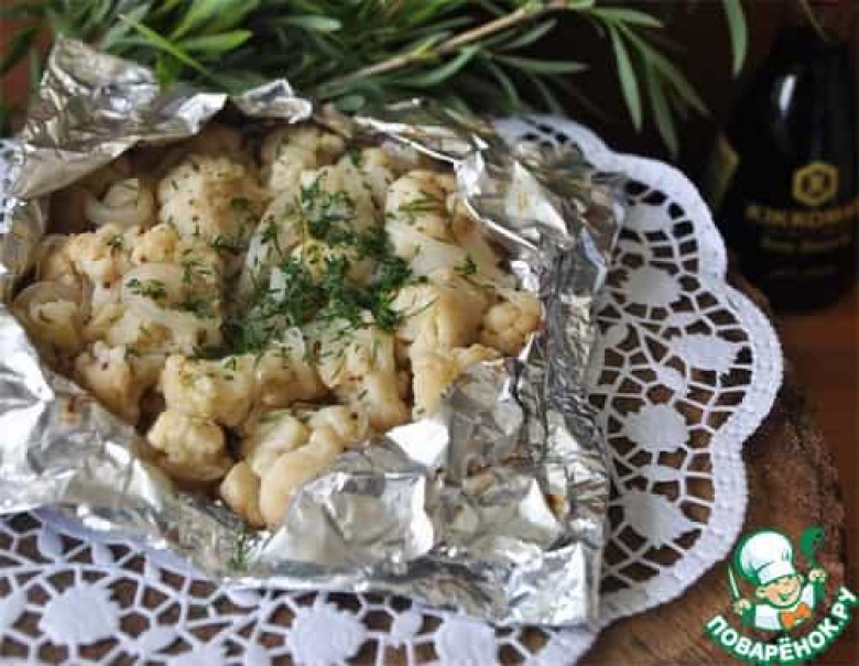 Ծաղկակաղամբի սոխի զանգվածը դնել այդ սոուսի մեջ, այնուհետ դնել ֆոլգայի վրա, փակել 4 կողմից։