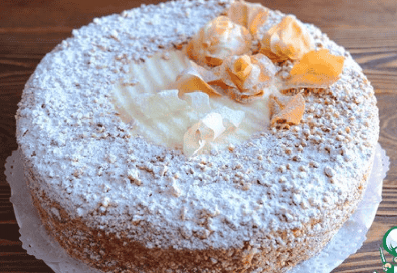 Շերտերին քսել կրեմը, վերջում ցանել մանրացրած խմորը։