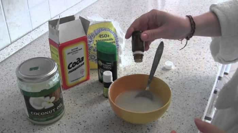 Իրար խառնեք սոդան ու եգիպտացորենի օսլան, ապա ավելացրեք կոկոսի յուղը: Թույլ կրակի վրա տաքացրեք այս զանգվածը, ավելացրեք որևէ տեսակի եթերային յուղ:
