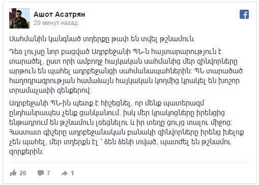 ԲԼՈԳԴեռ լույսը նոր բացված Ադրբեջանի ՊՆ-ն հայտարարություն է տարածել, ըստ որի ամբողջ հայկական սահմանից մեր զինվորները արթուն են պահել ադրբեջանցի սահմանապահներին: ՊՆ տարածած հաղոդրագրության համաձայն հայկական կողմից կրակել են խոշոր տրամաչափի զենքերով: