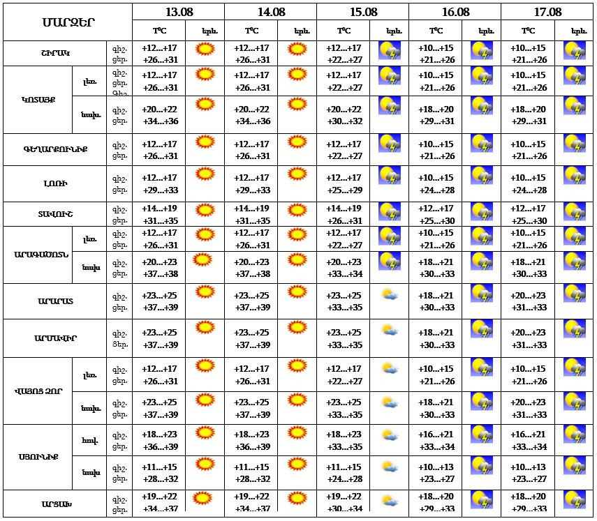 Երևան քաղաքում` օգոստոսի 13-14-ը սպասվում է առանց տեղումների եղանակ, 15-17-ը՝ երեկոյան ժամերին սպասվում է անձրև և ամպրոպ, ամպրոպի ժամանակ սպասվում է քամու ուժգնացում՝ 15-20 մ/վ: