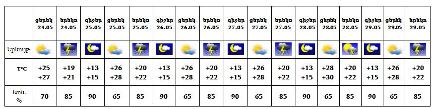 Ինչպես «Արմենպրես»-ին տեղեկացրին ՀՀ արտակարգ իրավիճակների նախարարությունից, Երևանում մայիսի 24-29-ը՝ կեսօրից հետո և գիշերվա առաջին կեսին, սպասվում է անձրև և ամպրոպ, ամպրոպի ժամանակ` քամու ուժգնացում 15-20 մ/վրկ արագությամբ: