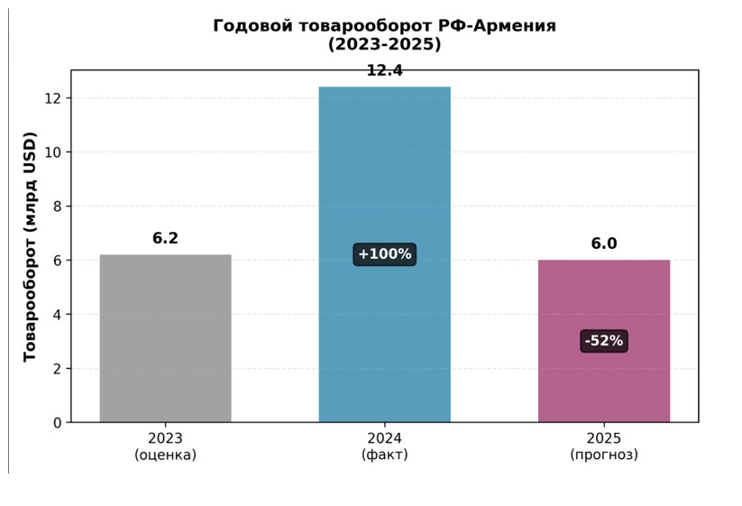 Таким образом, по нашим оценкам товарооборот между Арменией и Россией по итогам 2025 года достигнет более чем $7 млрд. Однако несмотря на резкое падение, Россия остается ключевым торговым партнером для Армении, на долю которой приходится 34.8% всего внешнеторгового оборота, и дальнейшая динамика будет зависеть от множества факторов, включая геополитическую обстановку, парламентские выборы и дальнейшие шаги Армении в своей внешнеэкономической политике.