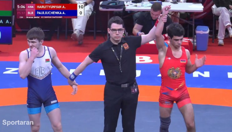 Арман Арутюнян (57 кг) также стал бронзовым призером. 19‑летний борец стартовал с поражения в квалификации от россиянина Аяндая Ондара (5:7), который вышел в финал и дал ему шанс продолжить борьбу. В утешительных схватках Арутюнян уверенно победил украинца Николая Братова (16:5), а в поединке за бронзу разгромил белоруса Павлюченко со счетом 10:0.